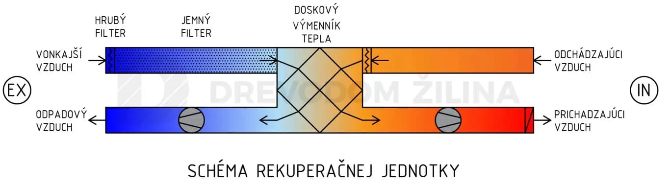 Pomocou systému potrubí je z miestnosti odvádzaný použitý/znečistený vzduch, ktorý ma izbovú teplotu. Do obytného priestoru je zároveň privádzaný čerstvý vzduch z exteriéru, ktorého teplota je veľmi nízka. Odvádzaný aj privádzaný vzduch prechádzajú cez rekuperačnú jednotku, v ktorej je umiestený výmenník tepla, ktorý odoberá teplo odvádzanému vzduchu a predohrieva vzduch privádzaný. Vzduch taktiež prechádza cez systém filtrov, ktorý zabraňuje znečisteniu, dostať sa do vnútorného prostredia budovy a tiež cháni pred zanesením potrubné rozvody a rekuperačnú jednotku.