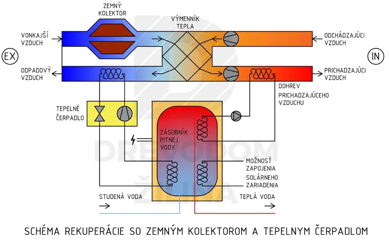 Teplo akumulované v zemi môžeme využiť pomocou zemného kolektora, ide o systém potrubí uložených cca 2m pod úrovňou terénu, ktoré zabezpečujú predhriatie vzduchu ešte pred vstupom do rekuperačnej jednotky, čím výrazne znižujeme množstvo tepla, ktoré bude potrebné dodať vzduchu prichádzajúcemu z exteriéru. Tento systém môžeme počas letného obdobia použiť na chladenie vzduchu.