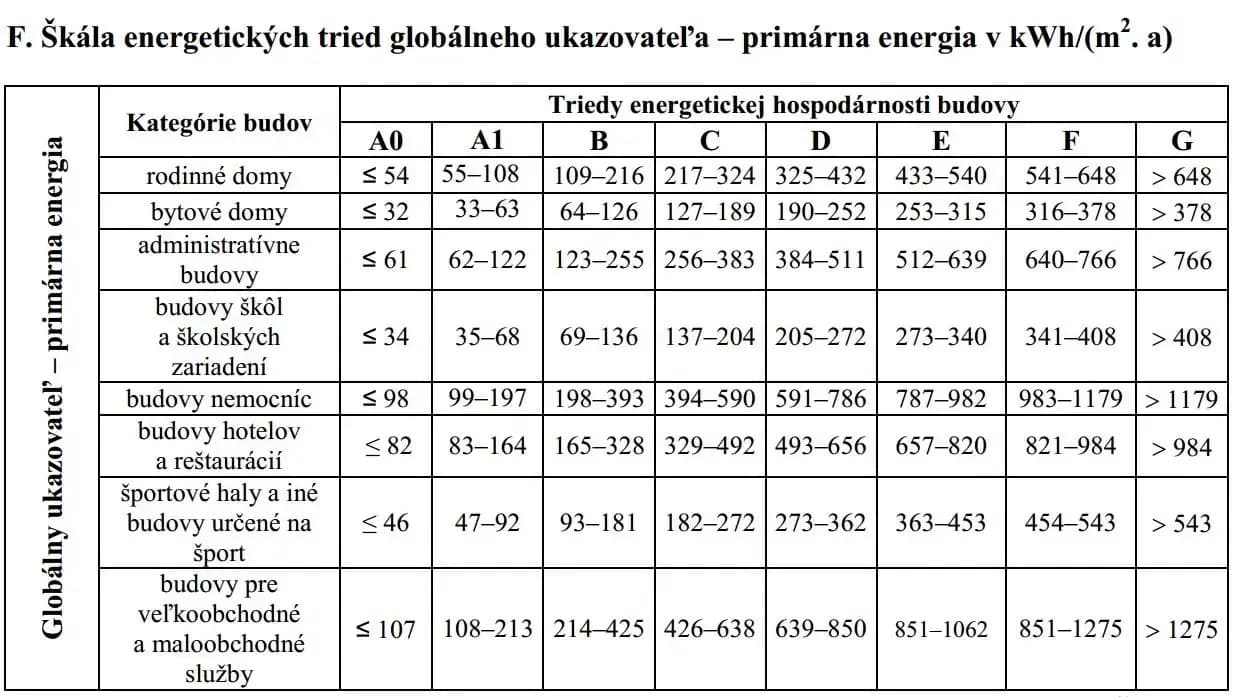 • od 1. januára 2019 pre nové budovy verejnej správy – energetická úroveň budov s takmer nulovou potrebou energie – daná hornou hranicou energetickej triedy A0