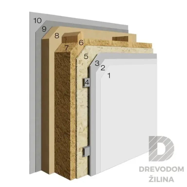 Pozostáva z fasádneho systému z polystyrénu s omietkou a sieťkou, z drevenej konštrukcie s OSB doskou a tepelnou izoláciou , paronepriepustnou fóliou s inštalačnou predstenou uzatvorenou sadrokartónom. Preniknutiu vodných par do konštrukcie zabraňujeme paronepriepustnou fóliou tzv. parozábranou. Pod týmto názvom rozumieme materiál, ktorý má vysoký faktor difúzneho odporu μ (bezrozmerná veličina vyjadrujúca, koľkokrát lepšie prepúšťa vodnú páru vrstva vzduchu ako daný materiál rovnakej hrúbky) alebo vysokú ekvivalentnú difúznu hrúbku Sd (vyjadruje koľko metrov vzduchovej vrstvy by svojimi difúznymi vlastnosťami nahradilo daný materiál). Môžeme si ju predstaviť ako PVC fóliu inštalovanú v závislosti od zvolenej skladby z interiéru na nosnú alebo pomocnú konštrukciu. Aby táto vrstva fungovala správne, nesmie byť v porušená. Spoje a prestupy musia byť zabezpečené neprievzdušne pomocou špeciálnej lepiacej pásky určenej na tieto účely.