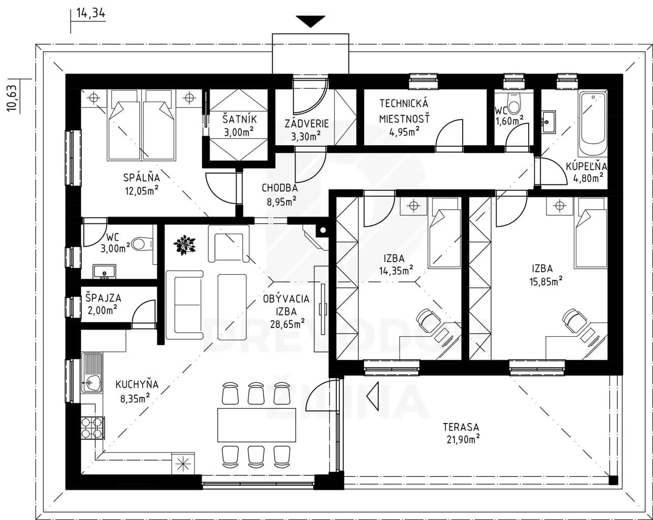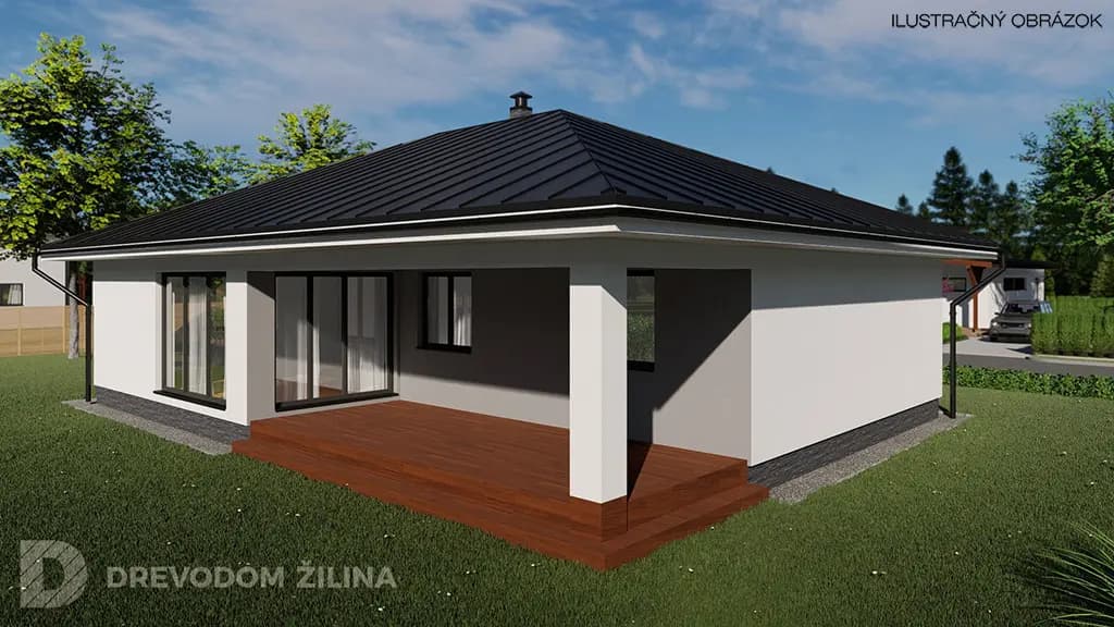 Phil je jednopodlažný rodinný dom prestrašený drevenými väzníkmi tvoriacimi valbovú strechu. Zo zádveria je prístup na chodbu, ktorá poskytuje vstup do spálne so samostatným šatníkom a WC, ďalej prístup do kúpeľne, samostatného WC a technickej miestnosti. V dome sú taktiež dve izby a priestranná obývacia izba s kuchyňou a špajzou, z časti jedálne je prístup na rozľahlú prestrašenú terasu.