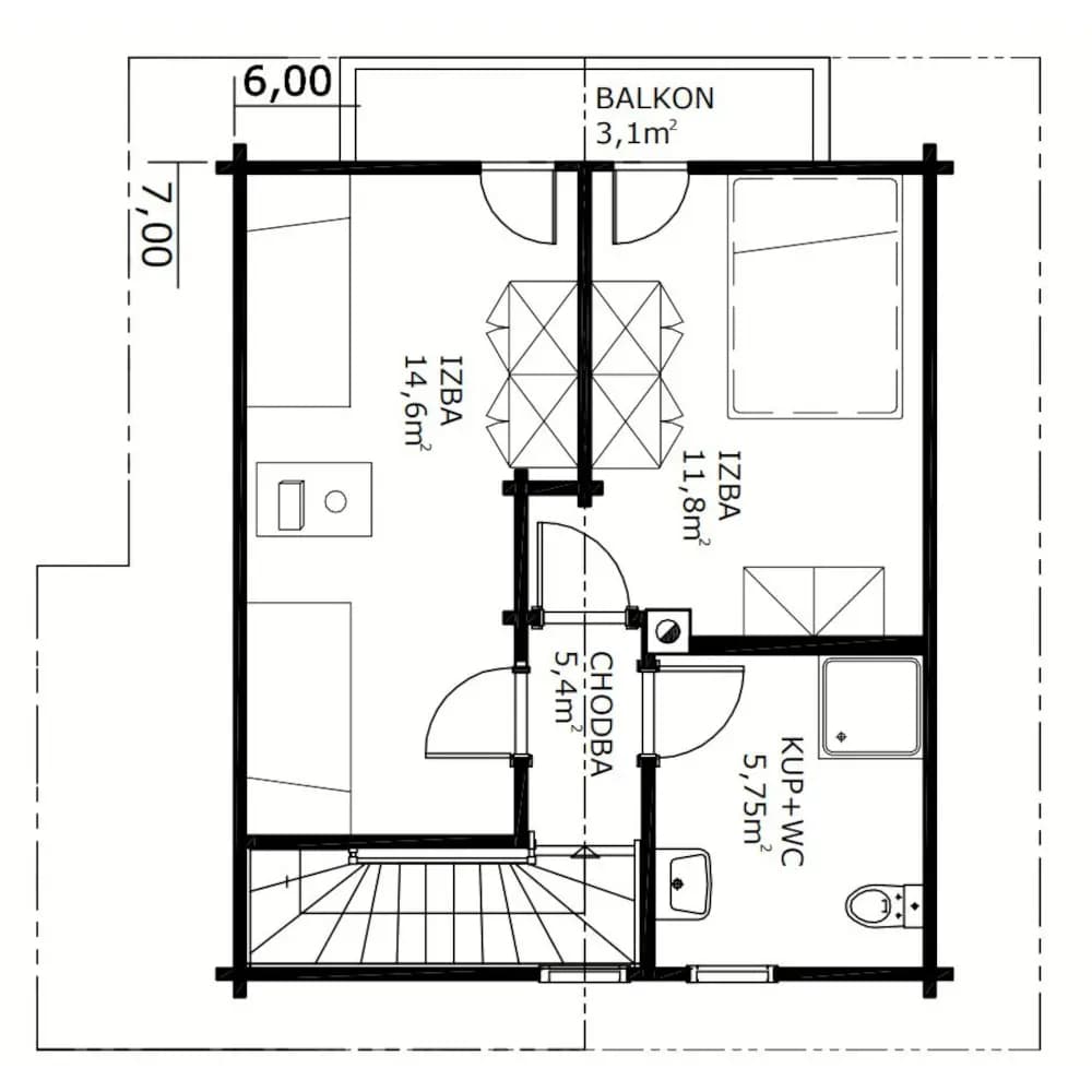 Z chodby je prístup do kúpelne spojenej s WC. Schodišťom sa dostaneme na 2 podlažie, kde sú 2 samostatné izby a kúpelňa spojená s WC. Z oboch izieb na 2 podlaží je prístup na balkón.