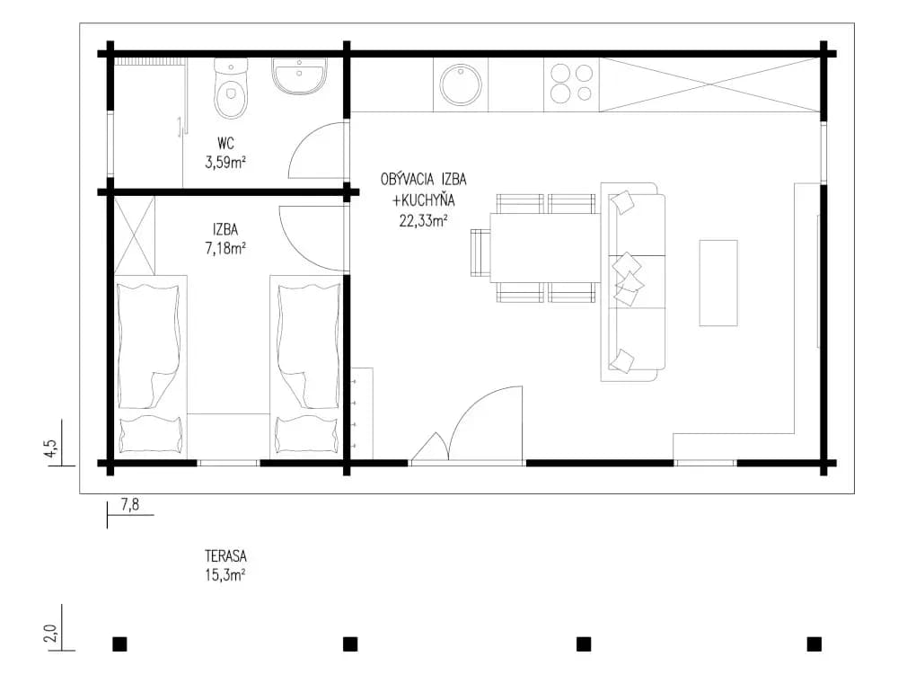 Rekreačná chata Majka ponúka úžitkovú plochu o veľkosti 33m². Kuchyňa a obývacia časť sú spojené a tvoria najvačšiu časť stavby. Nachádza sa tu priestranná kúpelňa spojená s WC a samostatná izba. Celá stavba je vzdušná priestranná a ponúka tak komfort a veľký priestor k rekreácii. Pred vstupom je na celú dĺžku chaty predĺžená časť strechy formou pergoly, možnosť využívať aj ako terasu. Rekreačná chata Majka je jednopodlažná zrubová stavba.