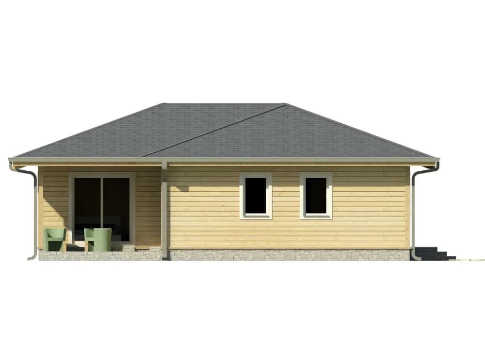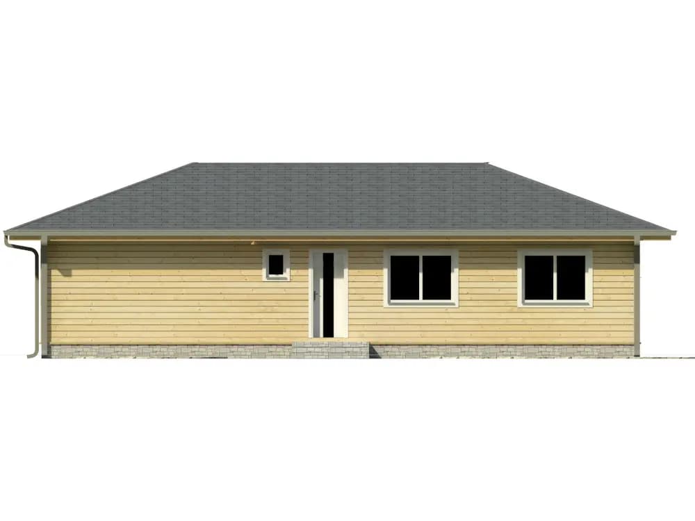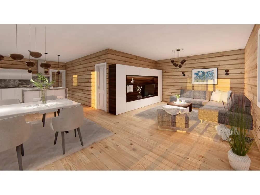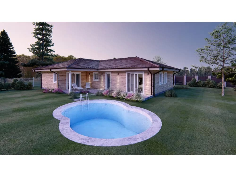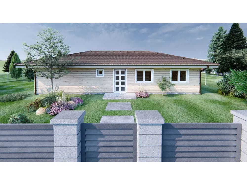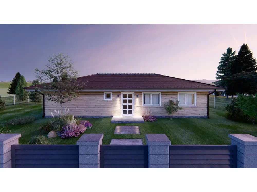 Zrubový jednopodlažný rodinný dom. Bungalovy sú často vyhľadávané kvôli bezbariérovosti ale i pre komfortný prechod všetkými časťami domu. Zo vstupnej chodby je prístup do samostatného WC. Kuchyňa je s obývacou časťou prepojená v tvare „L“ s výstupom na terasu. Dve samostatné izby a spálňa v nočnej časti domu majú prístup do kúpelne spojenej s WC. Zo spálne je vstup na terasu. Terasa je čiastočne prestrešená predĺženou časťou strechy. Pri kuchyni sa nachádza aj špajza. Krásny zrubový dom ideálny pre rodinu.