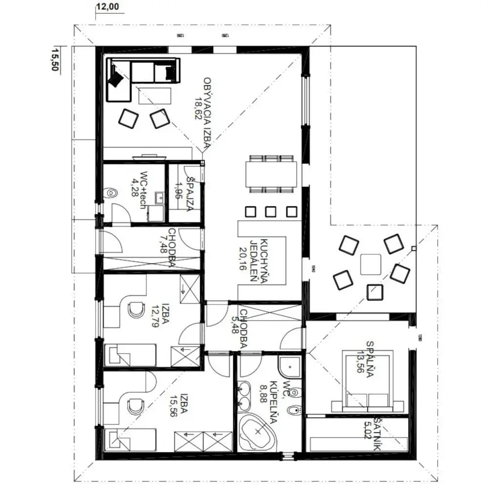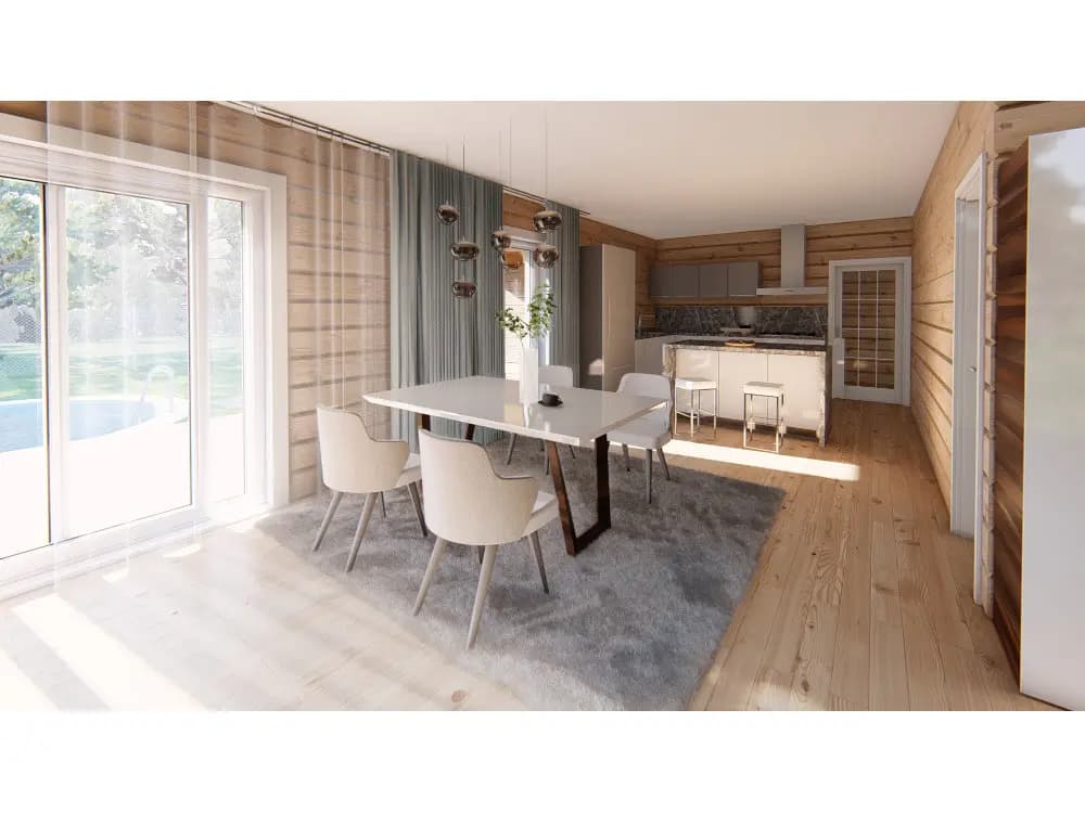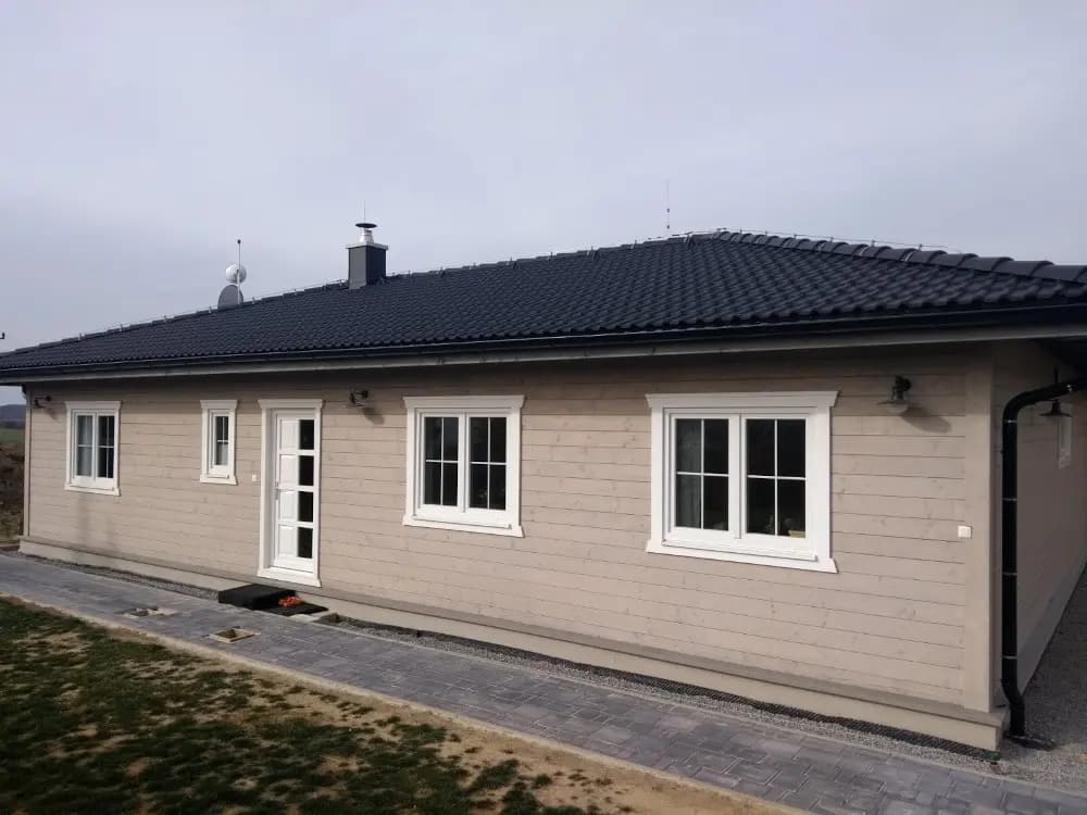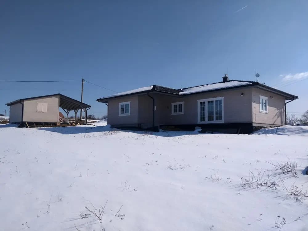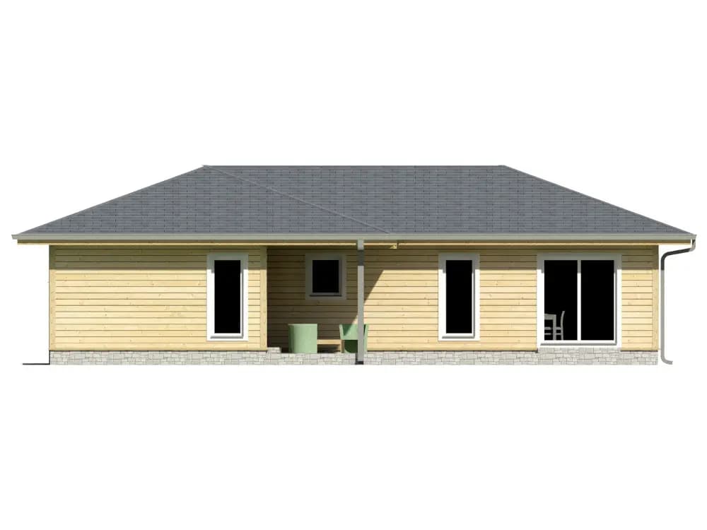 Zrubový jednopodlažný rodinný dom. Bungalovy sú často vyhľadávané kvôli bezbariérovosti ale i pre komfortný prechod všetkými časťami domu. Zo vstupnej chodby je prístup do samostatného WC. Kuchyňa je s obývacou časťou prepojená v tvare „L“ s výstupom na terasu. Dve samostatné izby a spálňa v nočnej časti domu majú prístup do kúpelne spojenej s WC. Zo spálne je vstup na terasu. Terasa je čiastočne prestrešená predĺženou časťou strechy. Pri kuchyni sa nachádza aj špajza. Krásny zrubový dom ideálny pre rodinu.