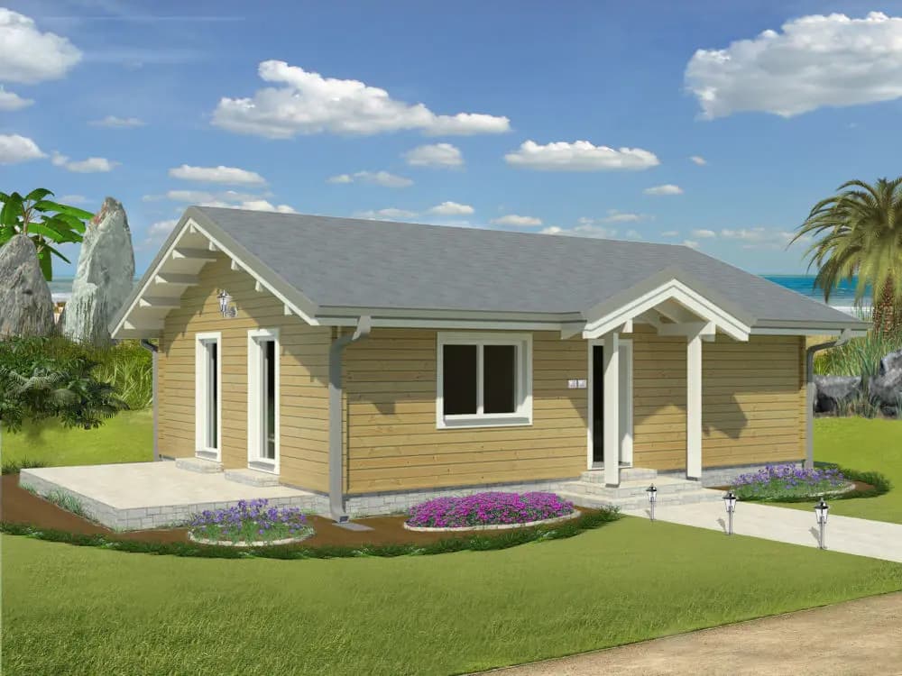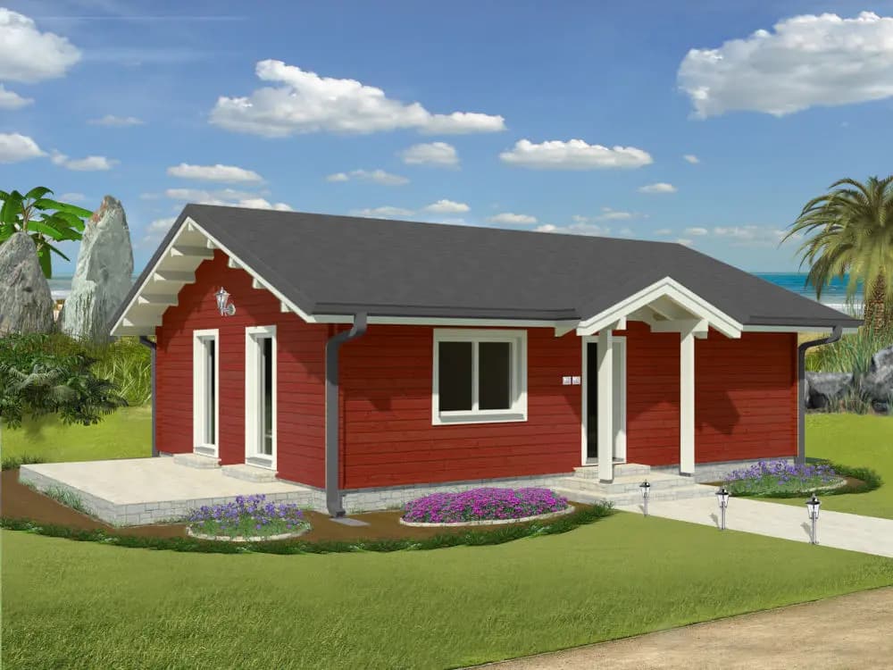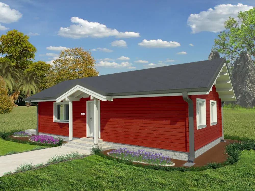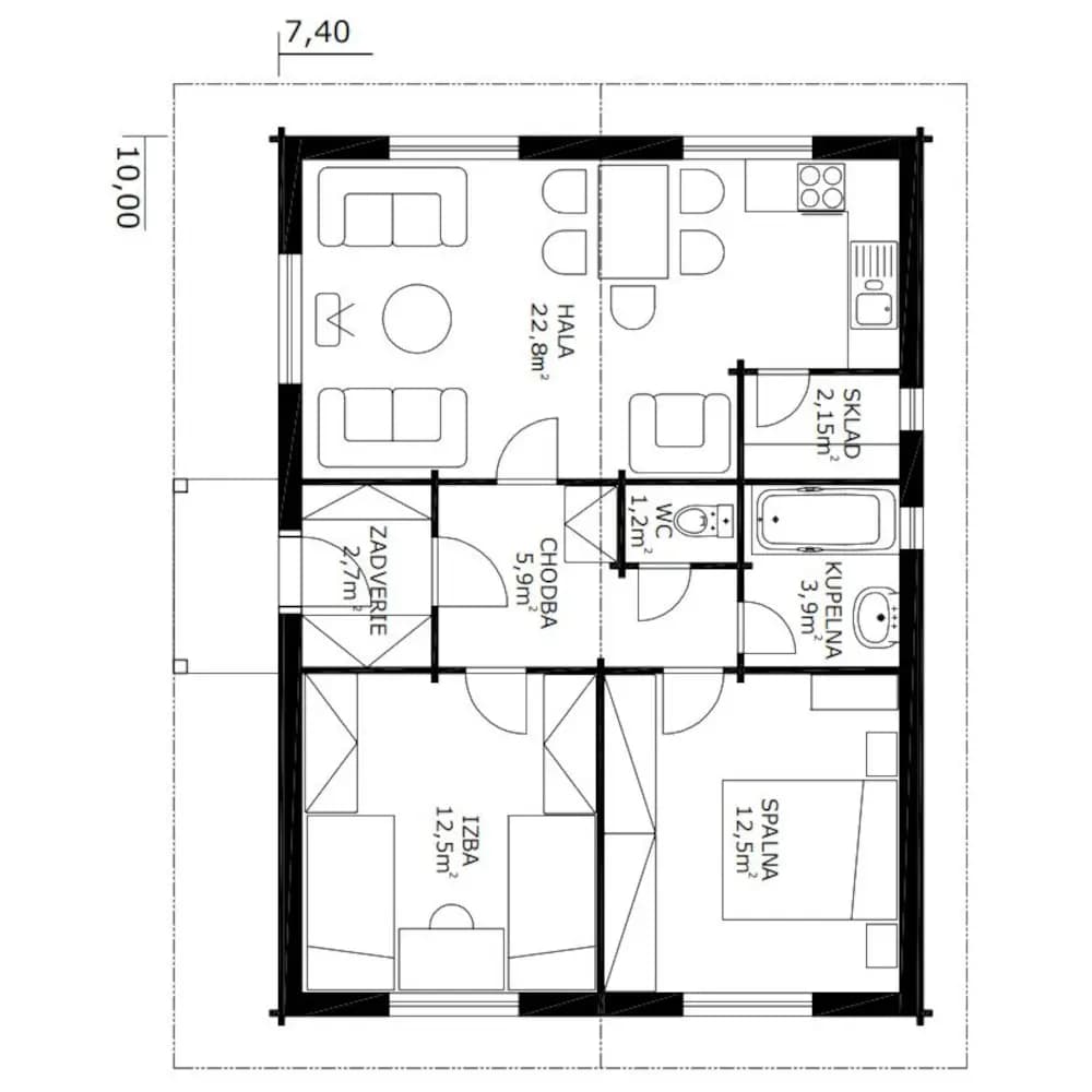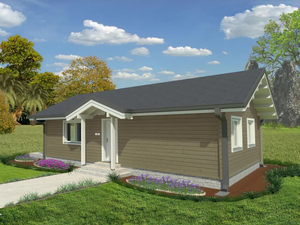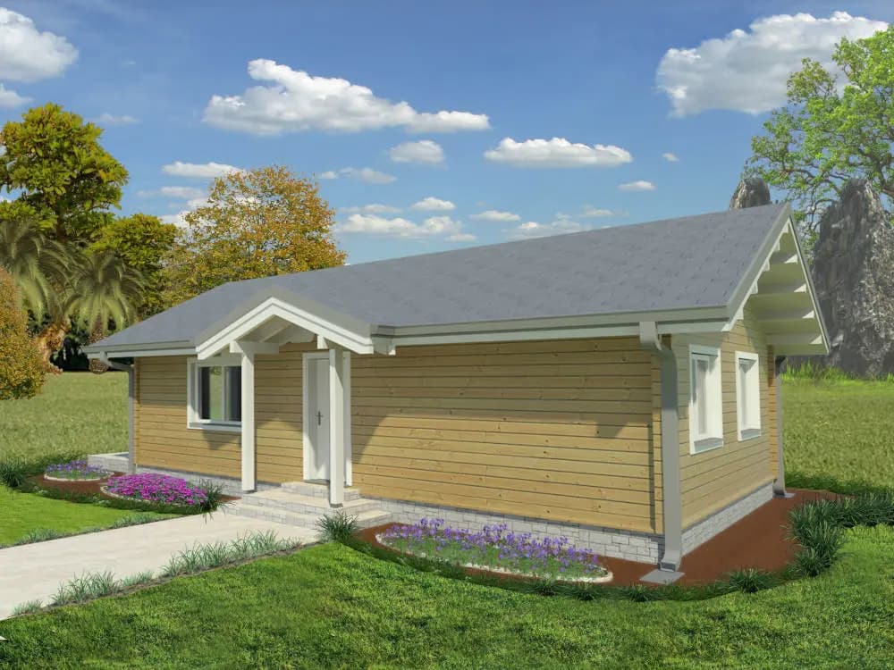 Zrubový jednopodlažný rodinný dom. Bungalovy sú často vyhľadávané kvôli bezbariérovosti ale i pre komfortný prechod všetkými časťami domu. Prestrešeným vstupom a zádverím prejdeme do vstupnej chodby odkiaľ je prístup do všetkých miestností domu. Kuchyňa je s obývacou časťou prepojená. Pri kuchyni je špajza. Z obývacej izby je možný výstup na budúcu terasu. Kúpeľňa a WC sú oddelené. Ďalej je tu spálňa a detská izba. Krásny dom ideálny pre 4 člennú rodinu.