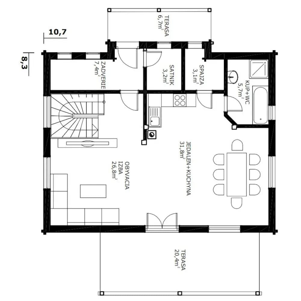 Dom komfort je delený na dennú časť v prízemí a nočnú časť na podlaží. Prestrešeným bočným vstupom prejdeme do do zádveria a priľahlého šatníka s oknami na presvetlenie priestoru. Zo zádveria vstúpime do veľkej kuchyne s jedálňou a obývacou časťou čo tvorí prevažnú časť prízemia. Pri kuchyni je špajza a kúpeľňa. Z kuchyne a obývačky je cez francúzske okná vstup na prestrešenú terasu. Schodišťom pri obývačke prejdeme na druhé podlažie, kde sa nachádza veľká spálňa s balkónom, šatník,dve samostatné izby a kúpeľňa s WC. Dom je priestranný, svetlý ideálny pre rodinu s deťmi.