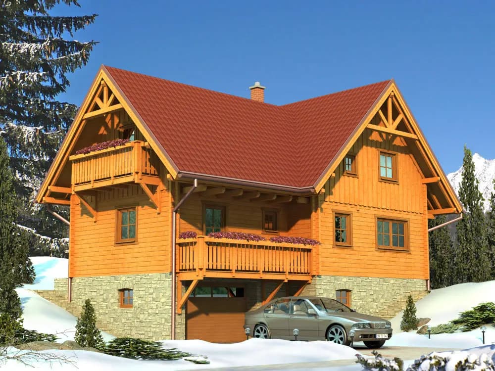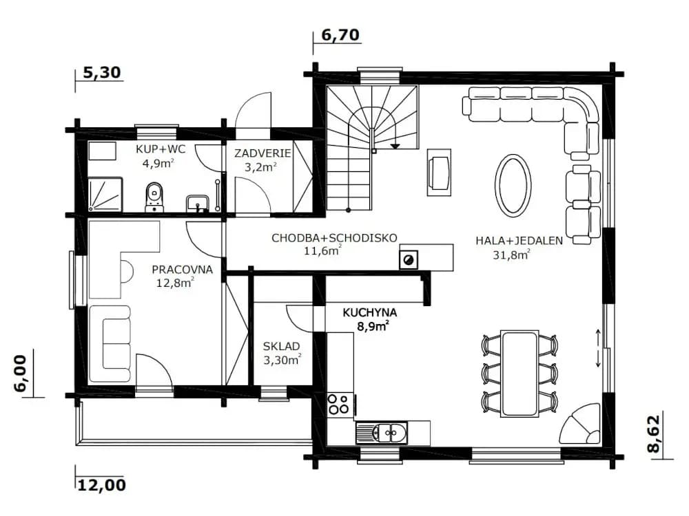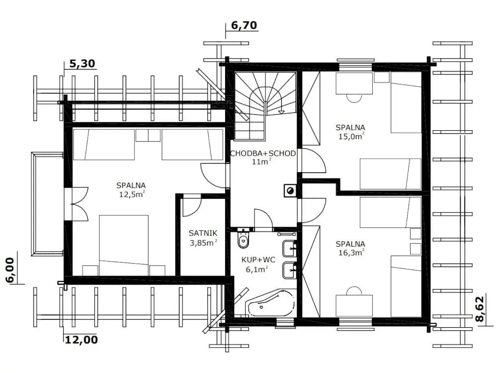 Luxusná drevostavba pre dostatok komfortu i súkromia. Za zádverím sa nachádza kúpeľňa s WC a pracovňa s balkónom. Kuchyňa so špajzou, obývačkou a jedálenskou časťou sú krásne prepojené a tvoria prevažnú časť prízemia. Priestor presvetľujú veľké francúzske okná, ktorými sa vchádza na otvorenú terasu. V kuchyni je nenápadne umiestená špajza. Na poschodí sa nachádza priestranná kúpeľňa, tri spálne z toho jedna s oddeleným šatníkom a balkónom. Tento dom je určený pre väčšiu rodinu s deťmi.