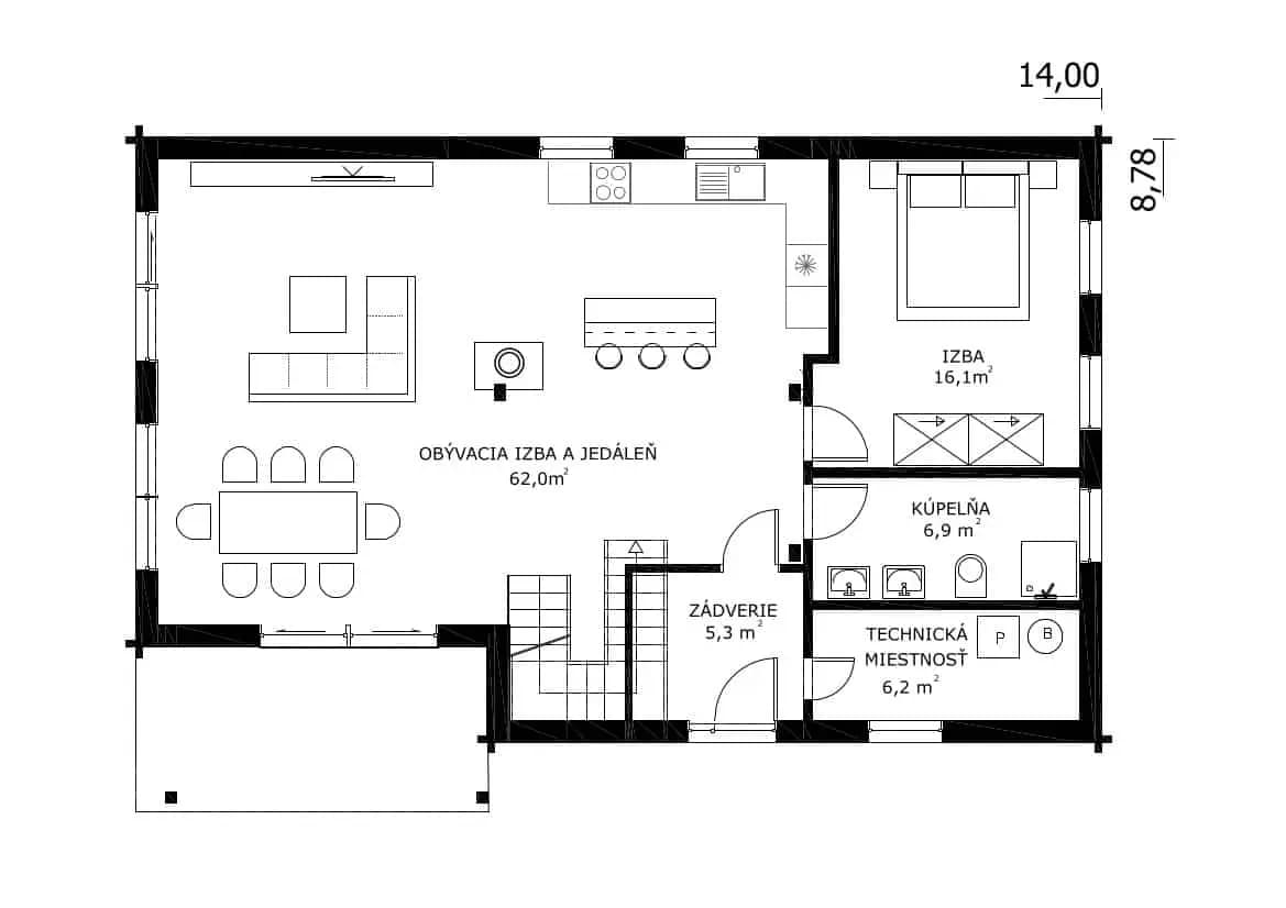 Zrubový dom Tono je moderný typ drevostavby s otvorenou galériou na poschodí. V dennej časti na prízemí zo zádveria sa priamo dostanete do obývacej izby a kuchyne. Z tohto priestoru je priami vchod do kúpeľne a vchod do spálne. Do technickej miestnosti sa dostanete zo zádveria . Na podlaží sa nachádzajú veľké priestranné izby. Na podlaží je aj kúpeľňa s WC a z jeden izieb aj priestranný šatník. Veľká galéria vám ponúka výhľad na obývací priestor.
