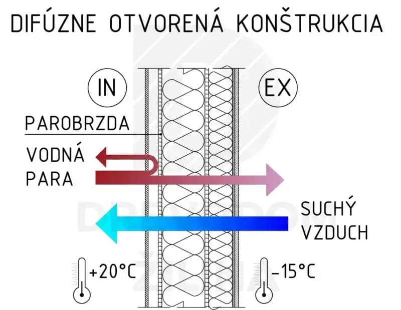 V skladbe je umiestnený materiál s najvyšším faktorom difúzneho odporu, čo najbližšie k interiéru, tzv. parobrzda, ktorá vodné pary iba brzdí, ale nezastavuje ich, na rozdiel od parozábrany. Keďže molekulárna vlhkosť preniká z interiéru do konštrukcie, musí mať voľnú cestu smerom von, aby mohla difundovať celou konštrukciou obvodových stien a odvetrať sa. Preto je dôležité použiť tepelnoizolačný materiál s nízkym faktorom difúzneho odporu. Ako parobrzda sa väčšinou používajú dosky na báze dreva, ktoré majú všetky spoje a prestupy utesnené špeciálnymi pásmi ako klasická parozábrana.. Takýto materiál má obmedzenú paropriepustnosť, avšak nie je úplne difúzne uzavretý. Táto konštrukcia sa dokáže vysporiadať so stavebnou a prevádzkovou vlhkosťou. Správna funkcia tejto steny je zaistená vytvorením neprievzdušnej obálky domu s utesnením spojov a aj tých najviac komplikovaných detailov.