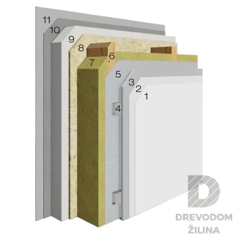 3. Sadrokartónový obklad hr. 12,5 mm – Sadrokartónová doska tvorí vnútorný obklad obvodovej steny, má hladký povrch a ľahko sa upravuje. Trieda reakcie na oheň A2 podľa STN EN 13501-1.